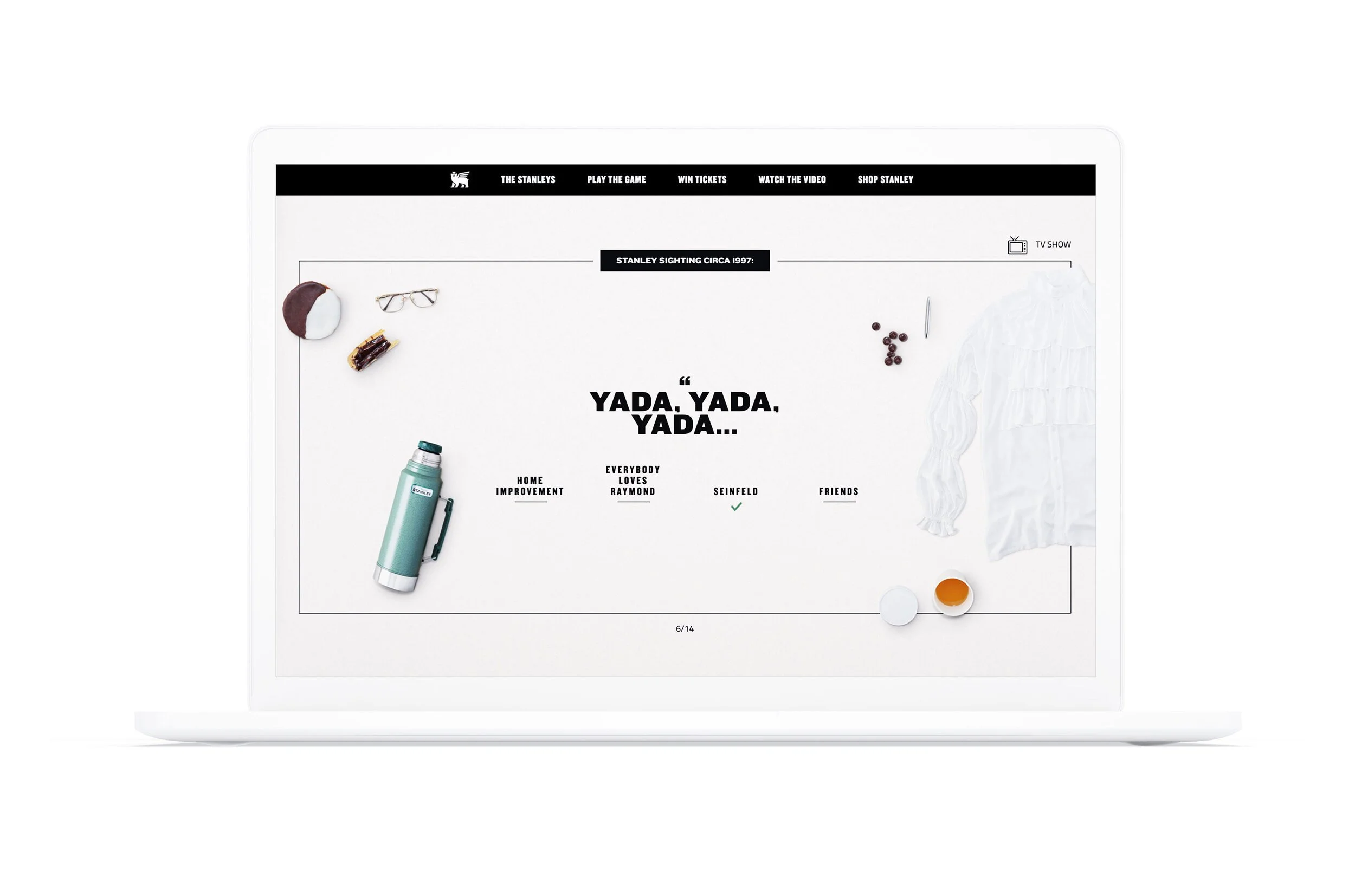Since entering the scene in 1913, Stanley has been a part of great stories in life and the outdoors. But we noticed something else: Stanley was frequently showing up in other stories — in the background of 60+ movies and TV shows. Debuting at Telluride Film Festival, this campaign challenged consumers to name all of the Stanley Sightings through executions spanning TV, print, social, and a microsite with an interactive quiz.